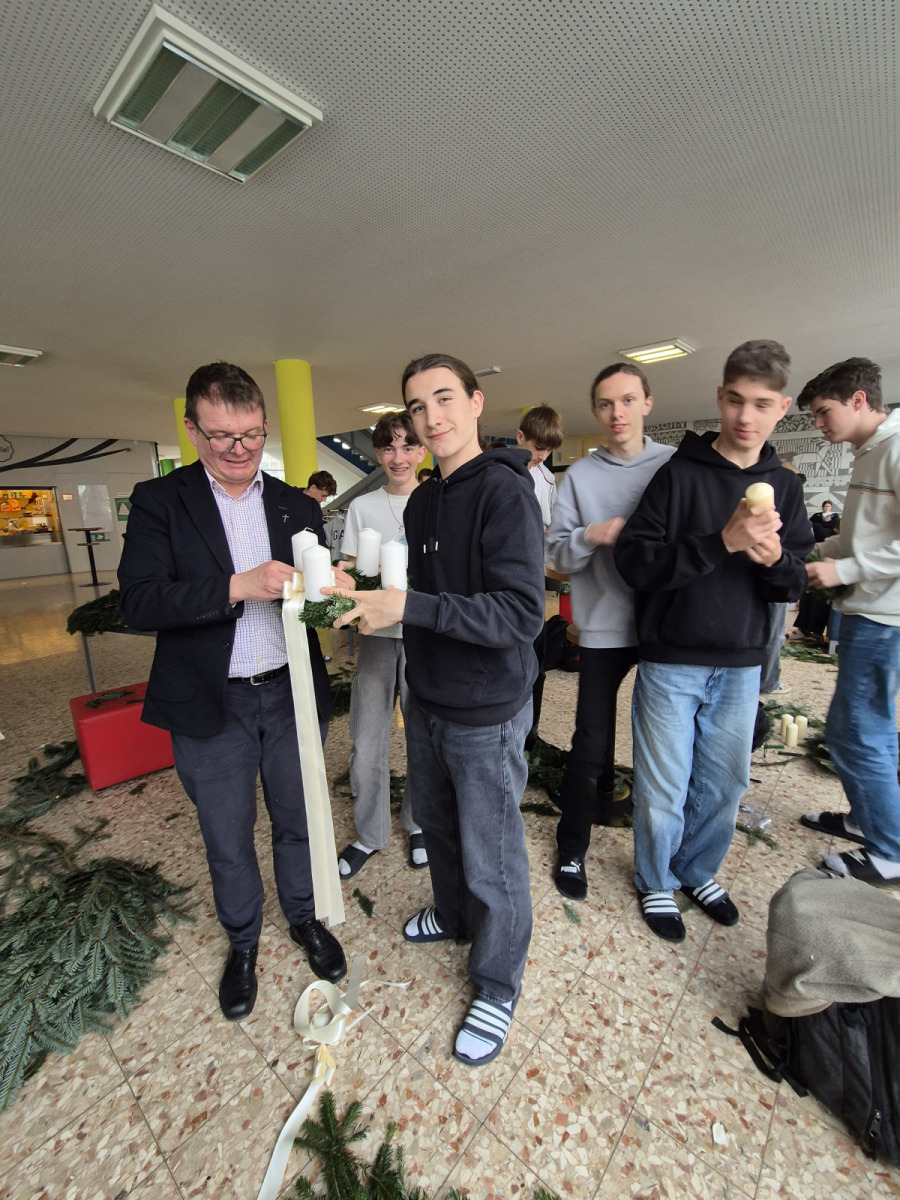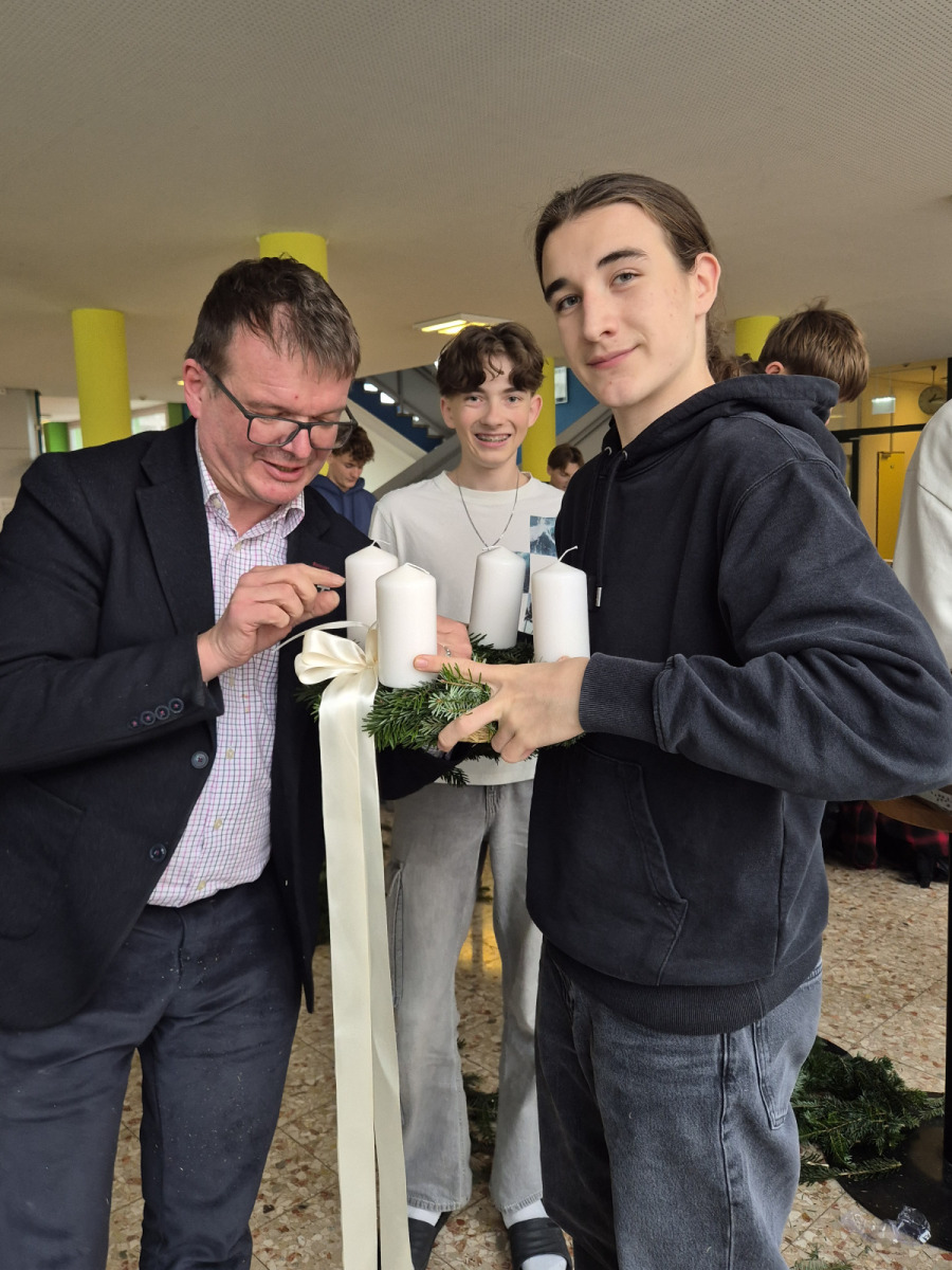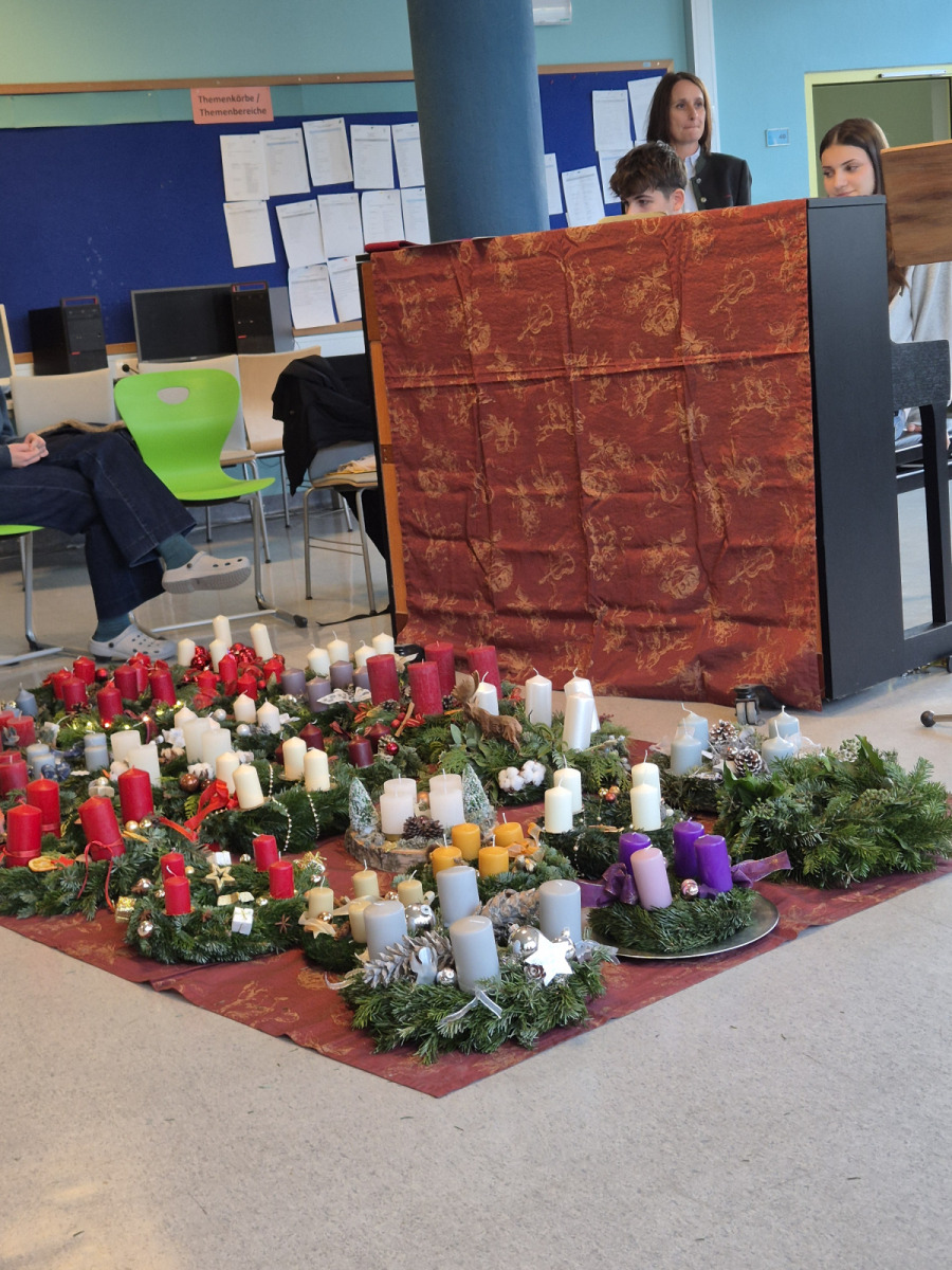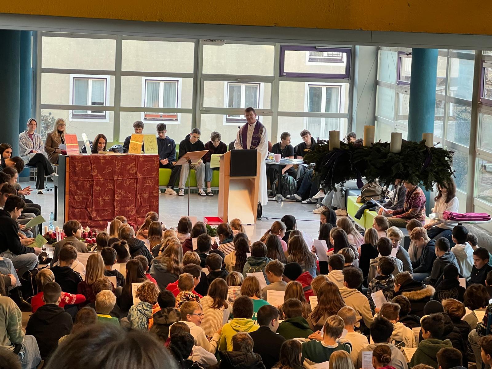 Unter reger Beteiligung aller Schüler*innen der ersten Klassen in Begleitung der jeweiligen Klassenlehrer*innen und der Klassenvertreter*innen der zweiten – achten Klassen fand am Freitag, 28.11.2025, in der Pausenhalle, die diesjährige Adventkranzsegnung statt. Prof. Gerlinde Renner-Galler hat den allseits beliebten Adventkalender wieder an den großen Fensterscheiben im Erdgeschoß angebracht. Prof. Vera Moser-Steiner hatte in bewährter Manier schon Wochen zuvor mit den ersten Klassen adventliche Lieder eingeprobt. Schulleiterin Pia Jaritz begrüßte alle Schüler*innen zur Adventkranzsegnung. Zwei virtuose Oberstufenschüler eröffneten die Adventfeier mit einem stimmigen Instrumentalstück. 5 Schülerinnen der 6 C erläuterten die Entstehung und den Sinn des Adventkranzes. Schüler*innen trugen die Geschichte von den vier Kerzen vor. In seiner Predigt verwies Prof. Johannes Baier auch auf die Rot-Kreuz-Adventaktion, unter der Leitung von Prof. Robert Bassa. Seit Jahren werden für bedürftige Menschen in der Adventzeit Grundnahrungsmittel gesammelt. Unter Aufsicht von Prof. Gerlinde Renner-Galler begannen die jeweils ersten Kerzen an den Kränzen, die Pausenhalle in ein wunderbares Lichtermeer zu verwandeln. Mit einem zackig vorgetragenen „Siyahamba – We are marching in the light of God“ zogen alle Schüler*innen und Lehrer*innen in ihre Klassenzimmer zurück. Ein großes Danke allen Mitwirkenden, die ein wenig Adventzauber in unsere Schule gebracht haben!