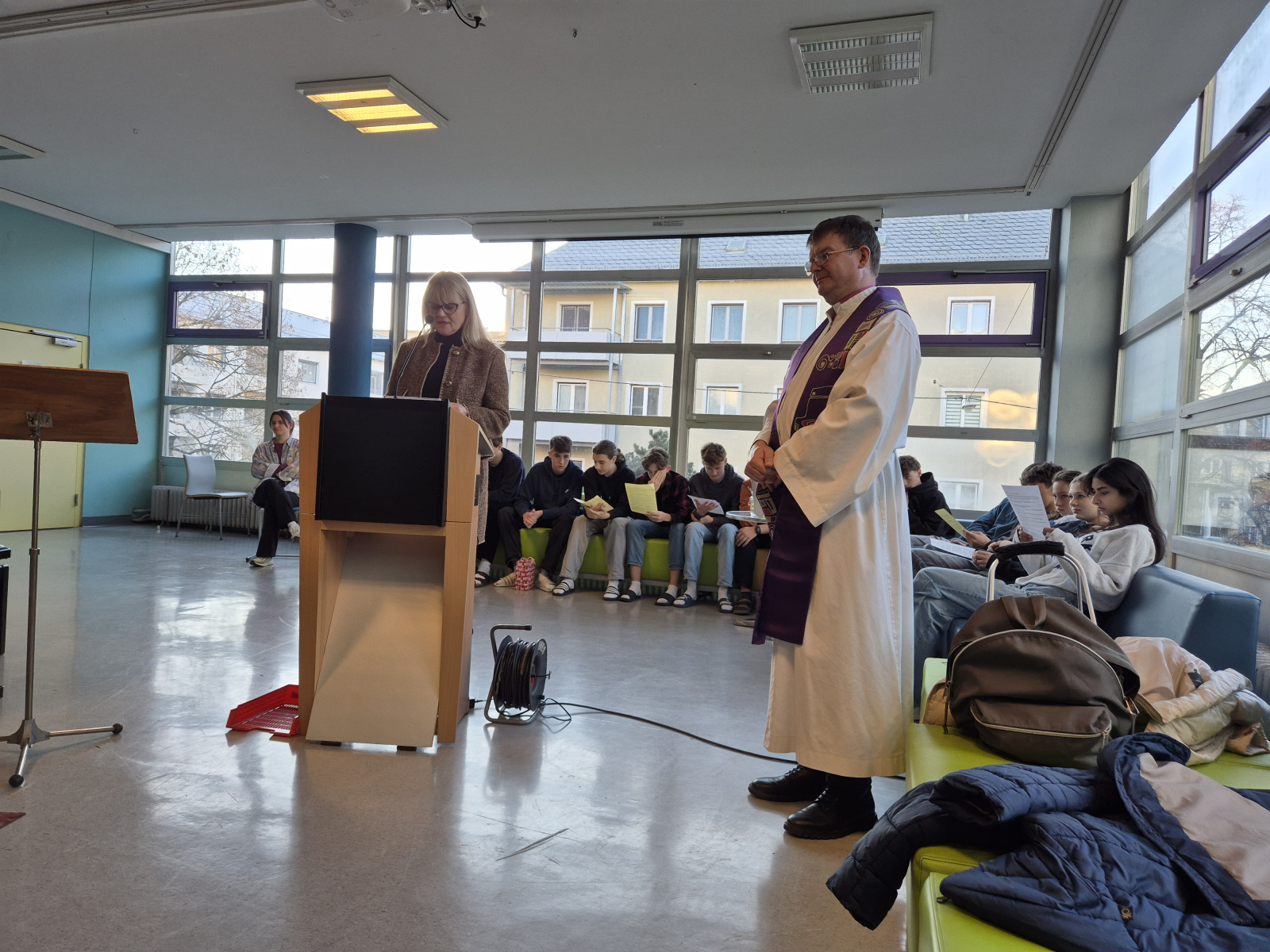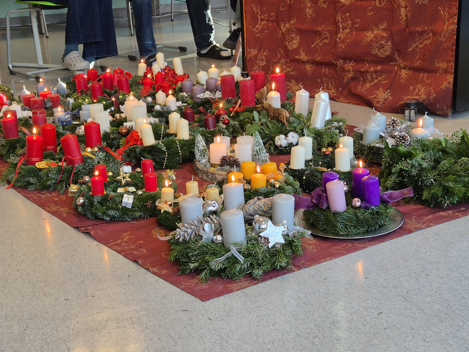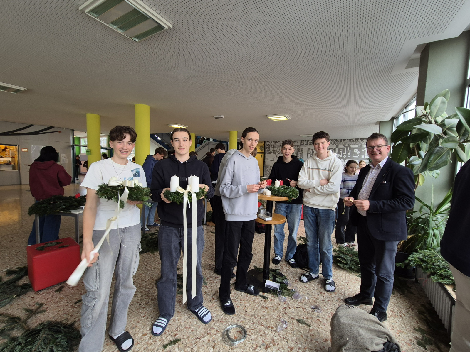 Unter reger Beteiligung aller Schüler*innen der ersten Klassen in Begleitung der jeweiligen Klassenlehrer*innen und der Klassenvertreter*innen der zweiten – achten Klassen fand am Freitag, 28.11.2025, in der Pausenhalle, die diesjährige Adventkranzsegnung statt. Prof. Gerlinde Renner-Galler hat den allseits beliebten Adventkalender wieder an den großen Fensterscheiben im Erdgeschoß angebracht. Prof. Vera Moser-Steiner hatte in bewährter Manier schon Wochen zuvor mit den ersten Klassen adventliche Lieder eingeprobt. Schulleiterin Pia Jaritz begrüßte alle Schüler*innen zur Adventkranzsegnung. Zwei virtuose Oberstufenschüler eröffneten die Adventfeier mit einem stimmigen Instrumentalstück. 5 Schülerinnen der 6 C erläuterten die Entstehung und den Sinn des Adventkranzes. Schüler*innen trugen die Geschichte von den vier Kerzen vor. In seiner Predigt verwies Prof. Johannes Baier auch auf die Rot-Kreuz-Adventaktion, unter der Leitung von Prof. Robert Bassa. Seit Jahren werden für bedürftige Menschen in der Adventzeit Grundnahrungsmittel gesammelt. Unter Aufsicht von Prof. Gerlinde Renner-Galler begannen die jeweils ersten Kerzen an den Kränzen, die Pausenhalle in ein wunderbares Lichtermeer zu verwandeln. Mit einem zackig vorgetragenen „Siyahamba – We are marching in the light of God“ zogen alle Schüler*innen und Lehrer*innen in ihre Klassenzimmer zurück. Ein großes Danke allen Mitwirkenden, die ein wenig Adventzauber in unsere Schule gebracht haben!