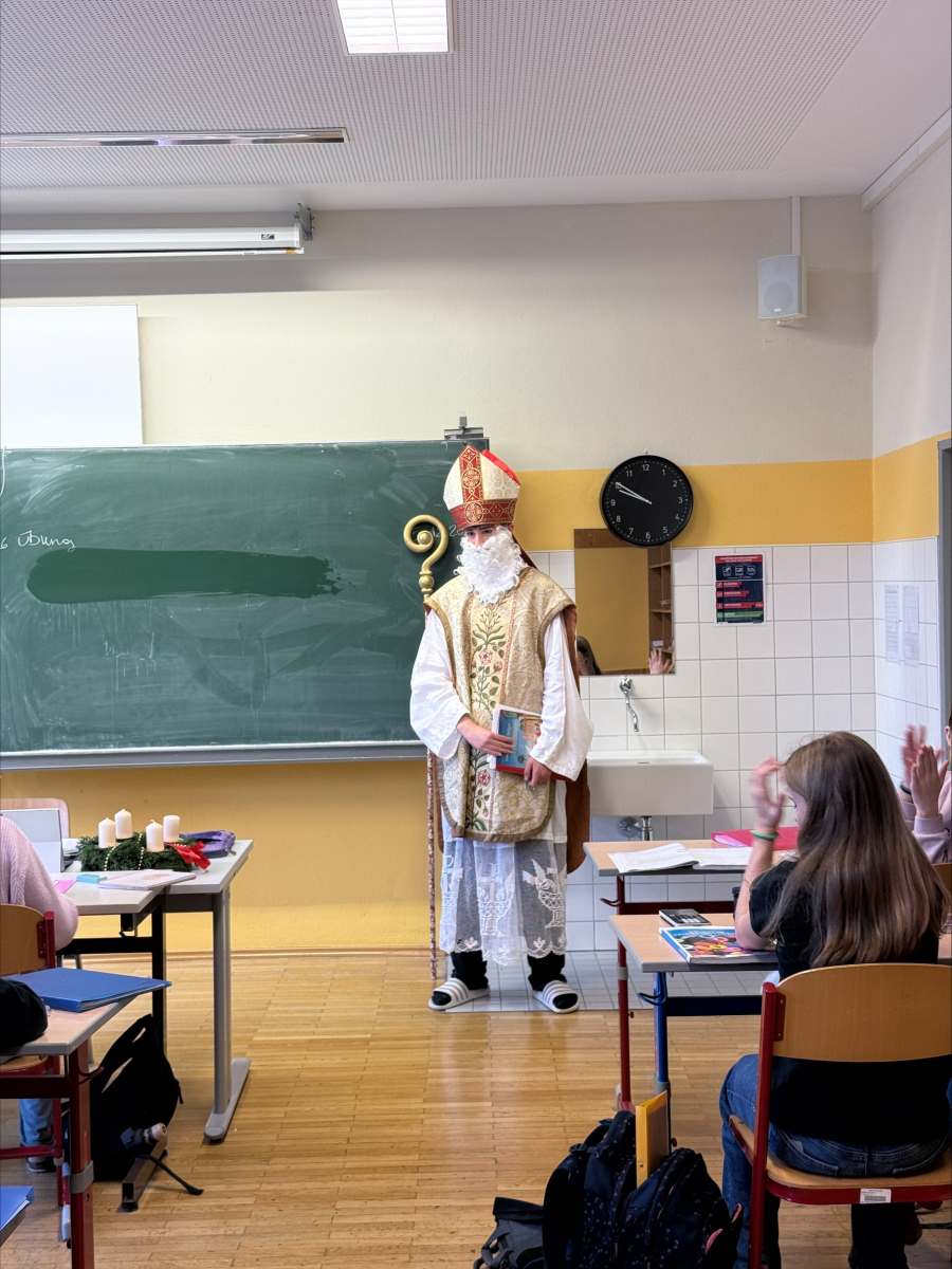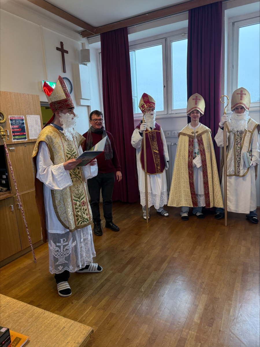 Aus diesem Anlass haben wir auch heuer wieder die Nikolausaktion an unserer Schule durchgeführt. Diesmal schlüpften Thiemo Greger, Jakob Hirsch, Noah Leitz und David Schwarz – alle aus der 6.C Klasse – in glänzende Nikolausgewänder, studierten die Nikolauslegenden und probten für ihre jeweiligen Klassenauftritte. Assistiert von Magdalena Nerwein, Alexandra Hayn, Miriam Wentner und Prarthna Khemani besuchten sie am Freitag, 05.12. alle Unterstufenklassen und versüßten ihnen mit kleinen Schoko-Nikoläusen den Vormittag.