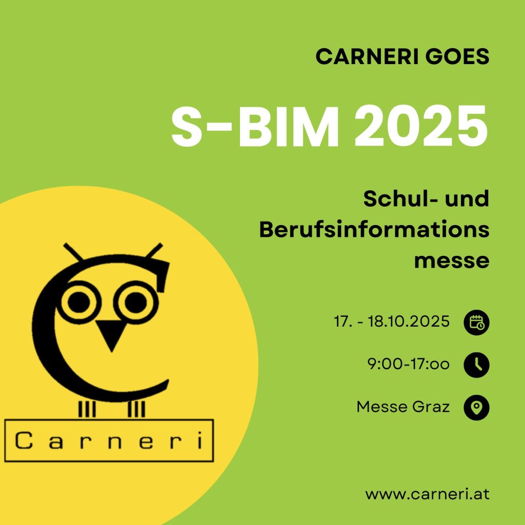 Am 17. und 18. Oktober 2025 ist das BG/BRG Carnerigasse auf der Schul- und Berufsinformationsmesse (S-BIM) in der Messe Graz vertreten. Besuchen Sie uns an unserem Stand und lernen Sie unsere Schule, unsere Schwerpunkte und unser vielfältiges Bildungsangebot kennen.