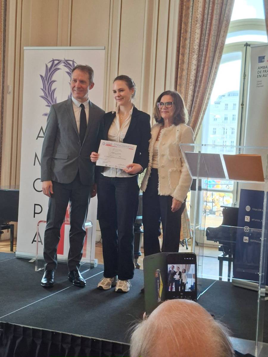 Am 17. April wurde es in der französischen Botschaft in Wien sprachlich spannend: Der Bundeswettbewerb Sprachmania – ganz im Zeichen der französischen Sprache – brachte die besten Nachwuchstalente aus ganz Österreich zusammen. Mit dabei die steirische Landessiegerin aus dem Carneri, die sich mit ihrem Können für diesen besonderen Wettbewerb qualifizieren konnte.